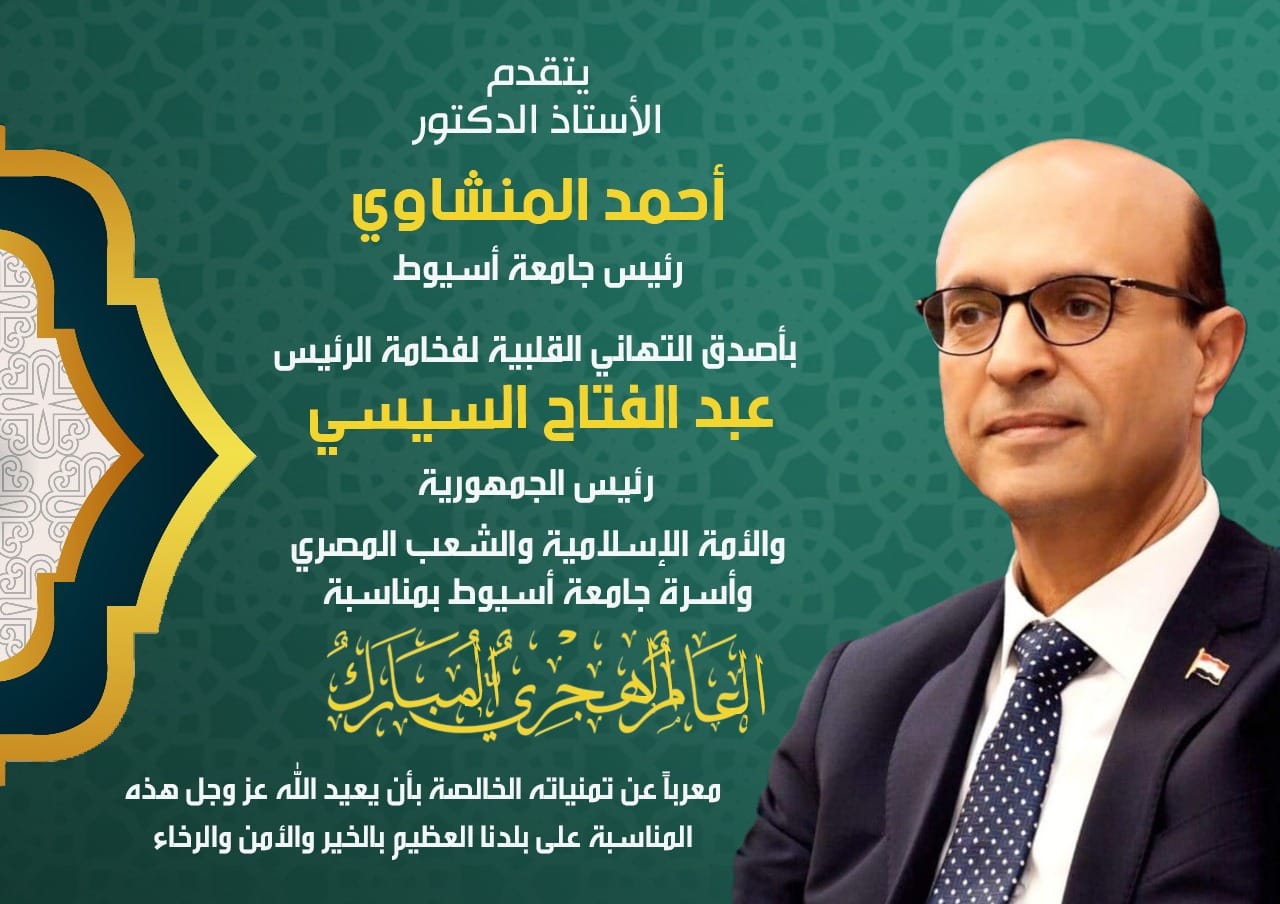 تقدم الدكتور أحمد المنشاوي رئيس جامعة أسيوط؛ بخالص التهنئة إلى الرئيس عبد الفتاح السيسي، رئيس الجمهورية؛ بمناسبة العام الهجري الجديد، داعيا المولى- عز وجل- أن يُعيدها على سيادته؛ بموفور الصحة، ودوام التوفيق.