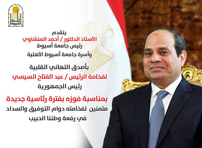 بعث الدكتور أحمد المنشاوي رئيس جامعة أسيوط، وأسرة جامعة أسيوط الأهلية؛ بأسمى وأرق التهاني إلى فخامة الرئيس عبد الفتاح السيسي؛ لفوزه بالانتخابات الرئاسية لفترة جديدة، والتي تأتي تتويجاً لاختيار الشعب، وثقته؛ في قيادة الرئيس الحكيمة على مدى السنوات الماضية، متمنين لفخامته دوام التوفيق والسداد؛ في رفعة وطننا الحبيب مصر.