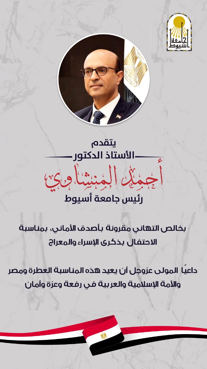 وقال رئيس جامعة أسيوط في نص البرقية: "بمشاعر يملؤها الإعزاز والتقدير يُسعدنى وأسرة جامعة أسيوط بمناسبة الإحتفال بذكرى الإسراء والمعراج، أن نبعث لسيادتكم بخالص التهنئة وأصدق الأمنيات، داعين المولى عزوجل أن يعيد هذه المناسبة الدينية الكريمة على سيادتكم وعلى مصر والأمة الإسلامية بالخير واليُمن والبركات”.
