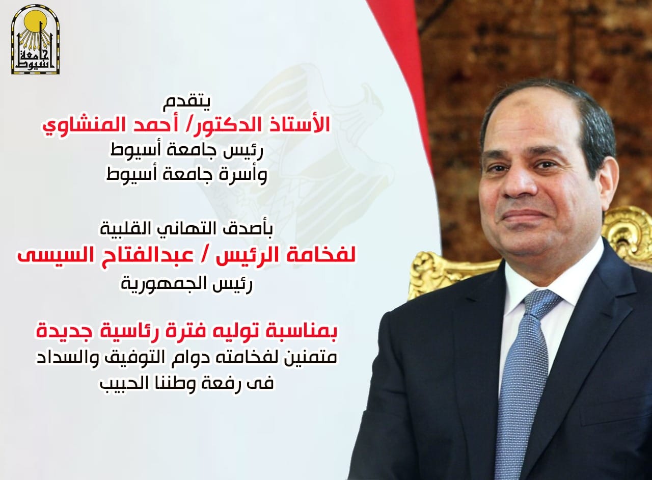 تقدم الدكتور أحمد المنشاوي رئيس جامعة أسيوط، بخالص التهاني القلبية للرئيس عبد الفتاح السيسي رئيس الجمهورية: بمناسبة تأدية اليمين الدستورية لتولي فترة رئاسية جديدة لجمهورية مصر العربية، داعيًا المولى -عز وجل- أن يوفقه، ويسدد خطاه لما فيه صلاح البلاد، والعباد، وتحقيق الأمن، والسلام، والتنمية، والازدهار لمصرنا الغالية، وأن يستكمل بقيادته الحكيمة المخلصة مسيرة بناء الوطن، وتحقيق تطلعات الأمة المصرية في الجمهورية الجديدة.