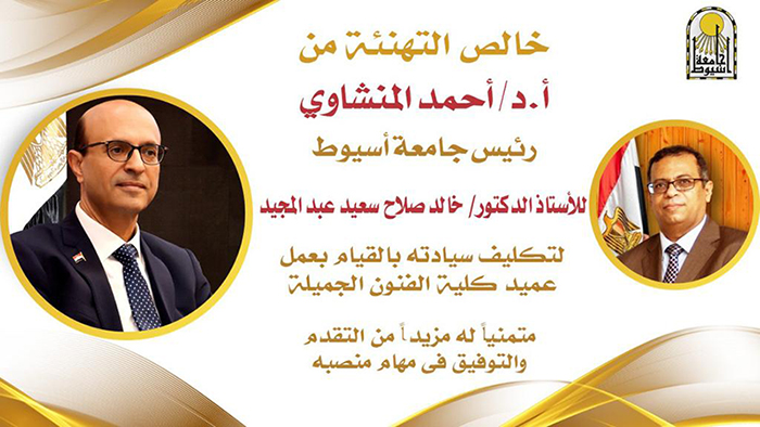 أصدر الدكتور أحمد المنشاوى رئيس جامعة أسيوط، قراراً بتكليف الدكتور خالد صلاح سعيد عبد المجيد الأستاذ بقسم الهندسة المعمارية بكلية الهندسة للقيام بأعمال عميد كلية الفنون الجميلة بالجامعة لمدة عام.