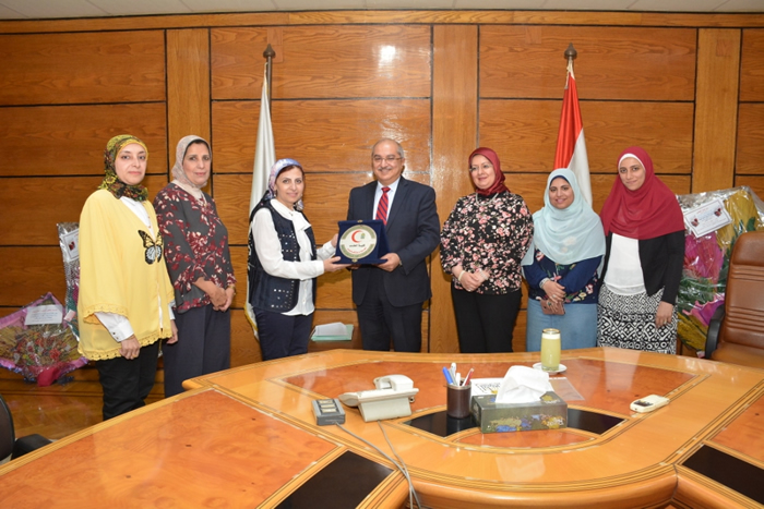 جاء ذلك خلال استقباله لعدد من أعضاء قسم الباثولوجيا الإكلينيكية بالجامعة والعاملين بمجمع المعامل المركزي ومنهم الدكتورة عزة محمود عز الدين رئيس القسم والمسئول عن المجمع ، والدكتورة مها عطوة مدير بنك الدم الرئيسي ، والدكتورة هبة الله راشد مديرة وحدة مكافحة العدوى إلى جانب عدد من أعضاء هيئة التدريس بالقسم والمختصين بالعمل داخل بنك الدم ، وذلك لتكريمهم وإهدائهم درع كلية طب وذلك لحصول بنك الدم المركزي على الاعتماد الدولي من المجلس الوطني للاعتماد (ايجاك) .