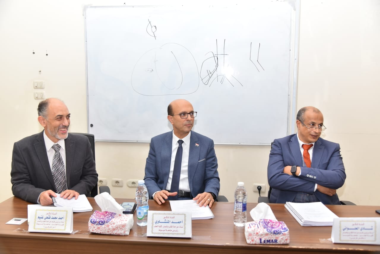 ناقش الدكتور أحمد المنشاوي رئيس جامعة أسيوط؛ رسالة الدكتوراة المقدمة من الطبيب: مصطفى كامل عبد النعيم حسين، المدرس المساعد في جراحة القلب والصدر، بكلية الطب - جامعة أسيوط، بعنوان: "مقارنة النتائج الأولية، والمتوسطة؛ لعملية استبدال جذع الشريان الأورطي، مع حفظ الصمام الأورطي بعملية بنتال"، وذلك بقسم جراحة القلب والصدر، بمستشفى القلب الجامعي.
