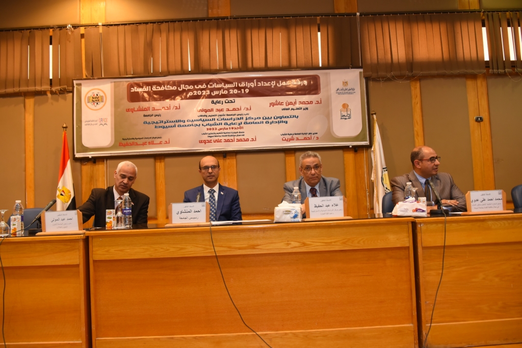 جاء ذلك خلال مشاركة سيادته فى افتتاح ورشة عمل لإعداد و تدريب الطلاب على عمل أوراق السياسات فى مجال مكافحة الفساد و التي ينظمها مركز الدراسات السياسية و الإستراتيجية بالتعاون مع الإدارة العامة لرعاية الشباب بالجامعة ، برعاية الدكتور أيمن عاشور وزير التعليم العالي و البحث العلمي ، والدكتور أحمد المنشاوى رئيس الجامعة، وبحضور الدكتور أحمد عبد المولى القائم بعمل نائب رئيس الجامعة لشئون التعليم و الطلاب ، و الدكتور علاء عبد الحفيظ عميد كلية التجارة و مدير مركز الدراسات السياسية و الإستراتيجية ، و الدكتور محمد العدوى منسق المبادرة العالمية للتعليم و تمكين الشباب فى مكافحة الفساد بجامعة أسيوط ووكيل كلية التجارة لشئون التعليم و الطلاب ، و لفيف من السادة أعضاء هيئة التدريس من مختلف كليات الجامعة و بمشاركة حشد طلابي المشاركين فى الورشة .