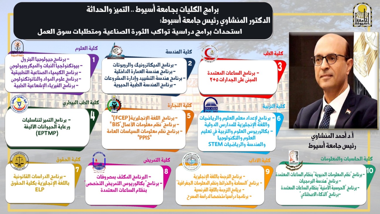 استعرض الدكتور أحمد المنشاوي رئيس جامعة أسيوط، تقريرا مقدما من الدكتور أحمد عبد المولى نائبه لشئون التعليم والطلاب، حول البرامج الدراسية في المرحلة الجامعية الأولى، التي تطلقها كليات الجامعة، حيث تطرح (27) برنامج دراسي من البرامج الخاصة في مختلف المجالات والتخصصات وهي: (البرامج الطبية – البرامج الهندسية وتكنولوجيا المعلومات – البرامج التجارية – برامج اللغات والترجمة – برامج علمية)، بنظام الساعات المعتمدة، والتي تواكب المعايير الدولية، والثورة الصناعية ومتطلبات سوق العمل المتجددة فى مجالاتها والمتزايدة فى حجمها محلياَ ودوليا،وخلق بيئة تعليمية مميزة جذابه للطلاب.