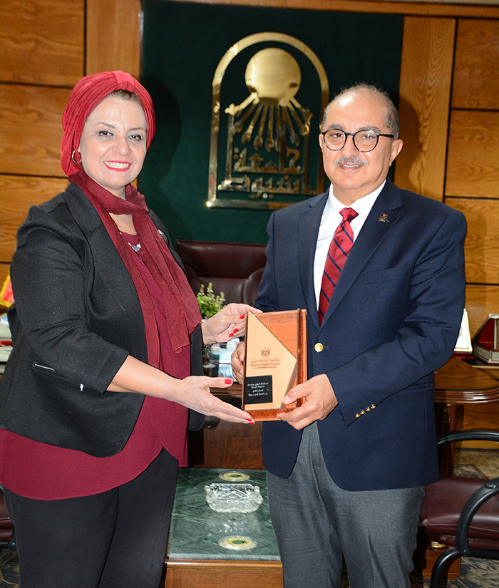 أستقبل الدكتور طارق الجمال رئيس جامعة أسيوط نائبته لقطاع خدمة المجتمع وتنمية البيئة الدكتورة مها كامل غانم وذلك لتسليم سيادته درع فوز جامعة أسيوط بالمركز الثاني كأفضل جامعة مصرية صديقة للبيئة وذلك وفق النتائج التى أعلنتها وزارة التعليم العالي والبحث العلمي برئاسة الدكتور خالد عبد الغفار ضمن مسابقتها السنوية التى شملت عدة محاور وهدفت إلى تقييم الجامعات المصرية للعام الجامعي 2020/ 2021 فى عدة مجالات.