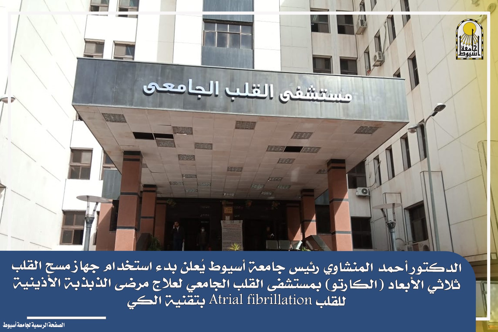 أعلن الدكتور أحمد المنشاوى رئيس جامعة أسيوط؛ عن بدء استخدام مستشفى القلب الجامعي لجهاز مسح القلب ثلاثى الأبعاد ( الكارتو )، حيث يتم استخدام الجهاز في تقديم خدمة جديدة لعلاج مرضى الذبذبة الأذينية للقلب Atrial fibrillation بتقنية الكي، تحت إشراف: الدكتور علاء عطيه عميد كلية الطب ورئيس مجلس إدارة المستشفيات الجامعية، والدكتور عصام عبدالله مدير مستشفى القلب الجامعى.
