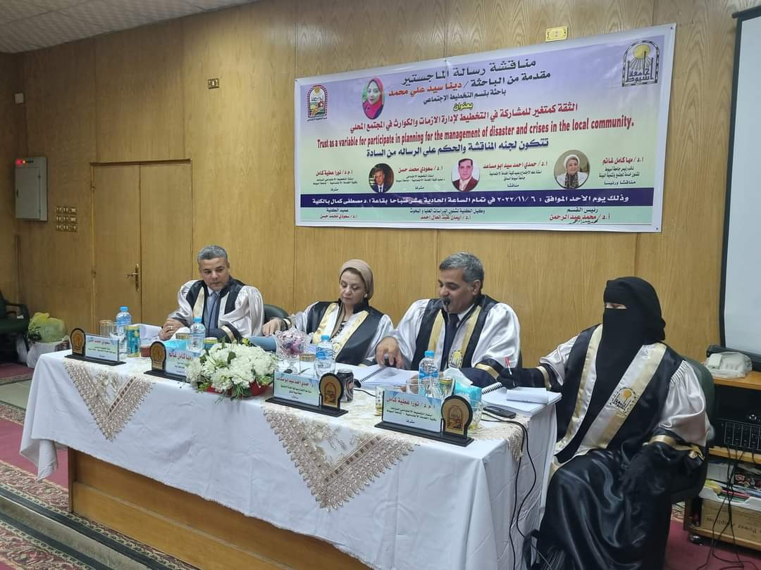 جاء ذلك تعقيباً مناقشة رسالة ماجستير بعنوان " الثقة كمتغير للمشاركة فى التخطيط لإدارة الازمات والكوارث في المجتمع المحلى" مقدمة من الباحثة دينا سيد على.