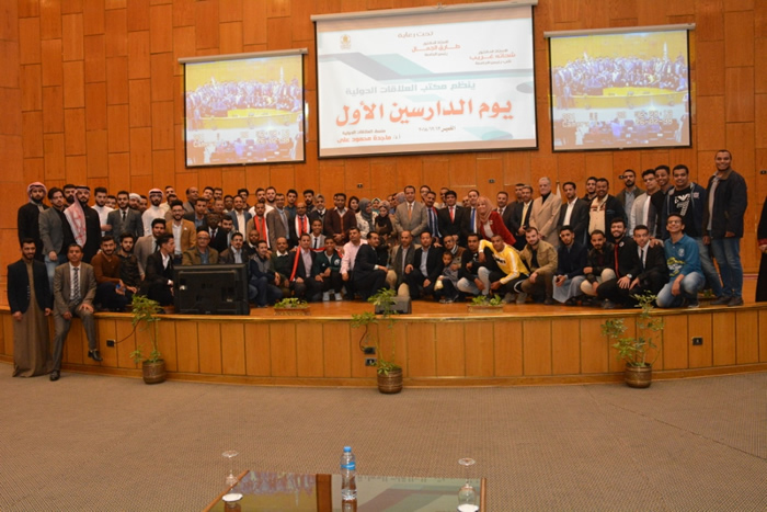 جاء ذلك خلال افتتاحه لفاعليات يوم الدارسين الأول و الذى ينظمه مكتب العلاقات الدولية بالجامعة ، وذلك تحت رعاية الدكتور طارق الجمال رئيس الجامعة ، وبحضور الدكتور أحمد صلاح قراعة عميد كلية التربية الرياضية ومنسق عام الأنشطة الطلابية بالجامعة ، والدكتورة ماجدة هاشم عميدة كلية رياض الأطفال ، و الدكتورة نجلاء طه وكيلة كلية طب الأسنان ، و الدكتورة ماجدة على منسق العلاقات الدولية ، والدكتورة نهى رزق مدير مركز اللغة الفرنسية ، والدكتورة محمد حسين موسى منسق مساعد شئون الجامعات العربية بالجامعة ، هذا إلى جانب مشاركة لفيف من ممثلى الجاليات العربية و الطلاب الوافدين من دول " السودان ، فلسطين ، العراق ، اليمن ، الكويت ، سوريا ، ماليزيا " .