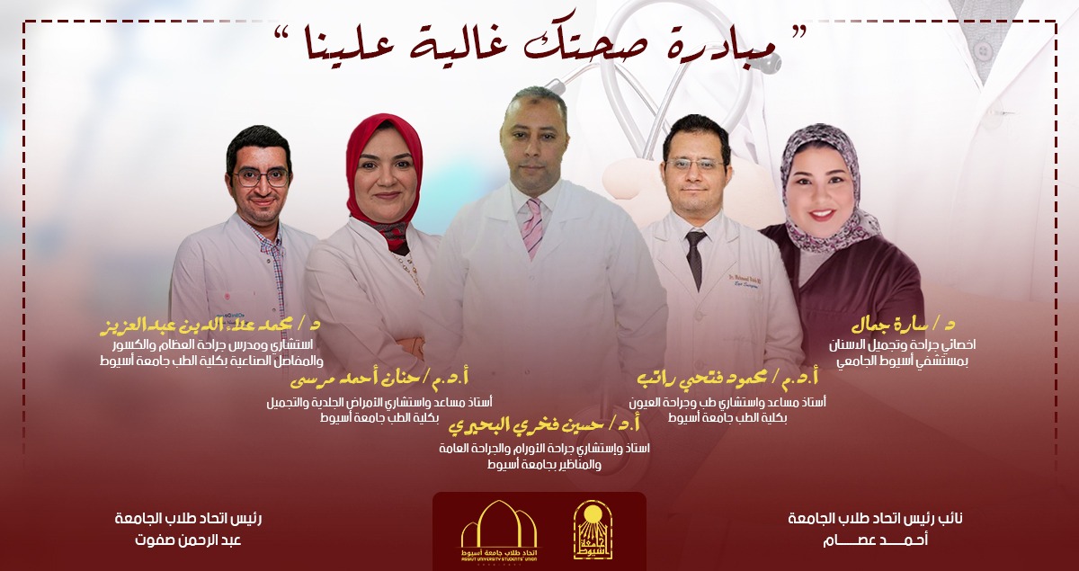 وفي السياق ذاته أعلن الدكتور شحاتة غريب نائب رئيس الجامعة لشئون التعليم و الطلاب عن تنظيم اتحاد طلاب جامعة أسيوط برئاسة الطالب عبد الرحمن صفوت رئيس اتحاد الطلاب ونائبه الطالب أحمد عصام الدين مبادرة "صحتك غالية علينا " وهي مبادرة طبية عن طريق التواصل أونلاين وذلك انطلاقاَ من حرص إدارة الجامعة لتوفير كافة سبل الرعاية لأبنائها الطلاب و للتيسير عليهم و الاستفادة من الخدمات الطلابية والعلاجية التي توفرها إدارة الجامعة من خلال مستشفياتها الجامعية و كوادرها الطبية المتخصصة في القطاع الطبي والتي تأتى استكمالاّ للمبادرات الطبية التي قد أطلقتها إدارة الجامعة في وقت مسبق كمبادرتي العلاج بالمجان وتطعيمك أمانك لتوفير منظومة طبية متكاملة لخدمة أبناءنا الطلاب ، مشيراَ إلى أن المبادرة يتوافر داخلها مختلف التخصصات الطبية تحت إشراف فريق طبي متميز و الذي يضم كلاَ من الدكتور حسين فخري أستاذ واستشاري جراحة الأورام العامة و المناظير بجامعة أسيوط و الدكتورة حنان احمد مرسى أستاذ مساعد و استشاري الأمراض الجلدية و التجميل بكلية الطب بجامعة أسيوط و الدكتور محمود راتب أستاذ مساعد و استشاري طب و جراحة العيوب بكلية الطب و الدكتور محمود علاء الدين عبد العزيز استشاري و مدرس جراحة العظام و الكسور و المفاصل الصناعية بكلية الطب و الدكتورة سارة جمال أخصائي جراحة و تجميل الأسنان بمستشفى أسيوط الجامعي .