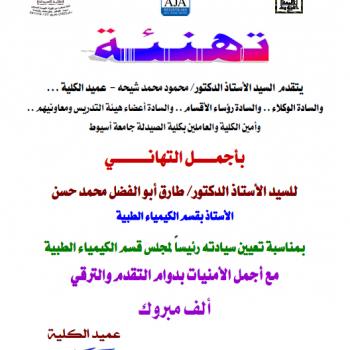 عميد كلية الصيدلة وأسرة الكلية يقدمون خالص التهنئة للسيد الأستاذ الدكتور: طارق أبو الفضل محمد حسن بمناسبة تعيين سيادته رئيساً لمجلس قسم الكيمياء الطبية بكلية الصيدلة.