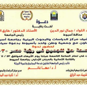 يتشرف مركز الدراسات والبحوث البيئية بجامعة اسيوط بالتعاون مع جمعية وطن واحد بأسيوط بدعوة سيادتكم لحضور ندوة "الصحة حق للجميع ف رؤية مصر 2030" وذلك فى تمام الساعة التاسعة صباحا يوم الأربعاء الموافق…