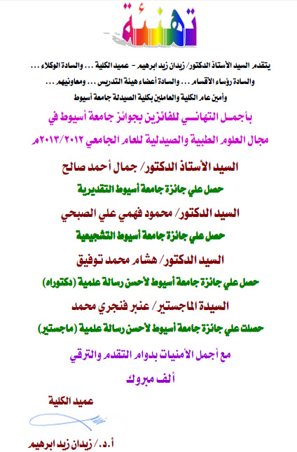 تفخر كلية الصيدلة بأبنائها الحاصلين علي جوائز جامعة أسيوط في مجال العلوم الطبية والصيدلية للعام الجامعي 2012/2013م. 22 أبريل 2014 تفخر كلية الصيدلة بأبنائها الحاصلين علي جوائز جامعة أسيوط في مجال العلوم الطبية والصيدلية للعام الجامعي 2012/2013م.