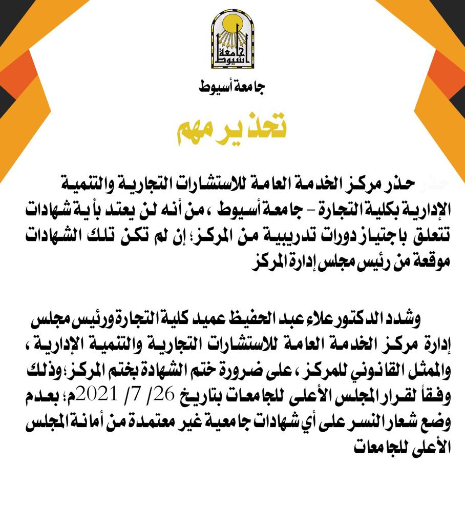 حذر مركز الخدمة العامة للاستشارات التجارية والتنمية الإدارية بكلية التجارة - جامعة أسيوط، من أنه لن يعتد بأية شهادات تتعلق باجتياز دورات تدريبية من المركز؛ إن لم تكن تلك الشهادات موقعة من رئيس مجلس إدارة المركز.