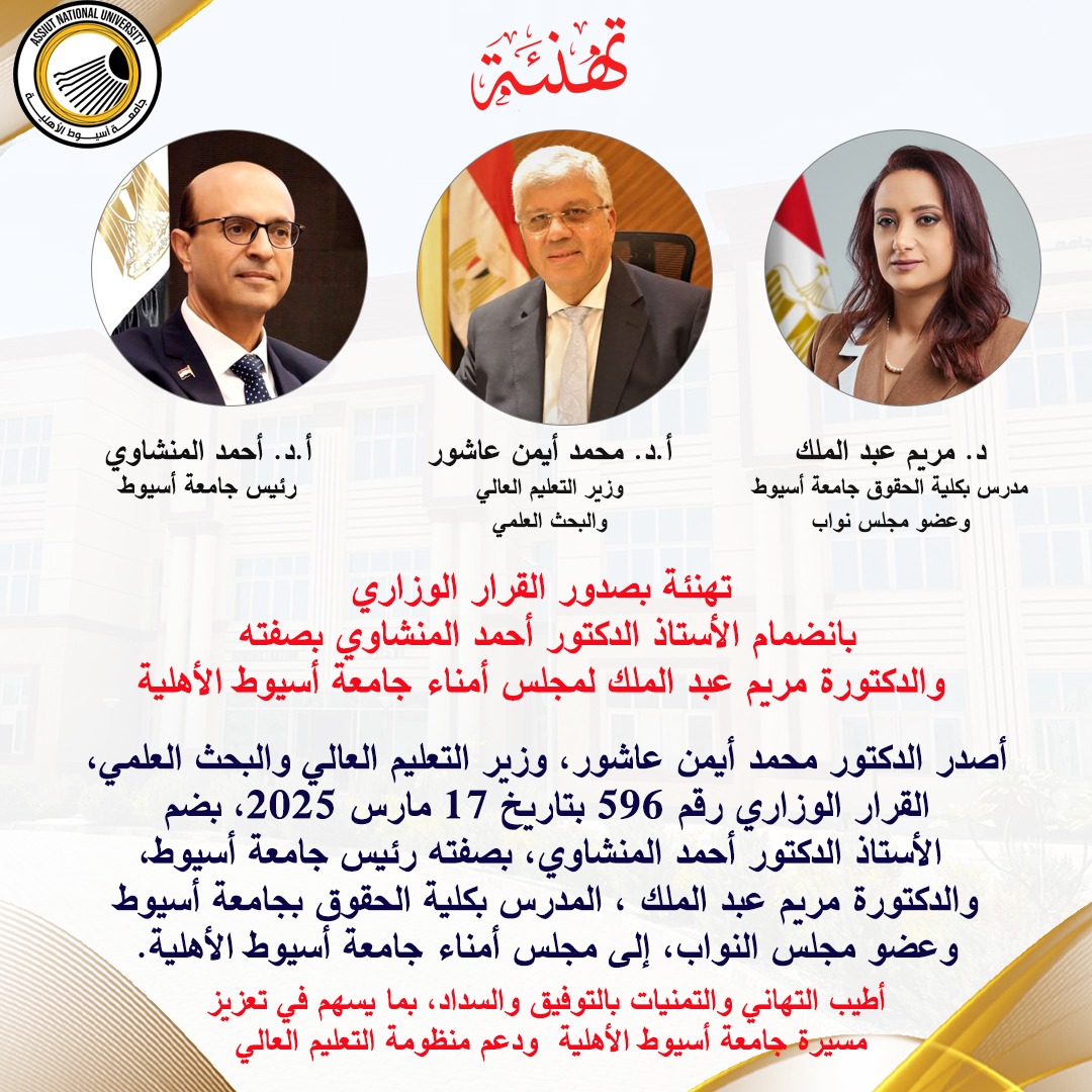 أصدر الدكتور محمد أيمن عاشور، وزير التعليم العالي والبحث العلمي، القرار الوزاري رقم ٥٩٦ بتاريخ ١٧ مارس ٢٠٢٥، بضم الدكتور أحمد المنشاوي، بصفته رئيس جامعة أسيوط، والدكتورة مريم عبد الملك القمص، المدرس بكلية الحقوق بجامعة أسيوط وعضو مجلس النواب، إلى مجلس أمناء جامعة أسيوط الأهلية.