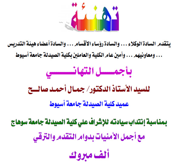 تهنئة للسيد الأستاذ الدكتور/ جمال أحمد صالح عميد كلية الصيدلة بمناسبة إنتداب سيادته للإشراف علي كلية الصيدلة جامعة سوهاج. 18 يونيو 2013 تهنئة للسيد الأستاذ الدكتور/ جمال أحمد صالح عميد كلية الصيدلة بمناسبة إنتداب سيادته للإشراف علي كلية الصيدلة جامعة سوهاج.