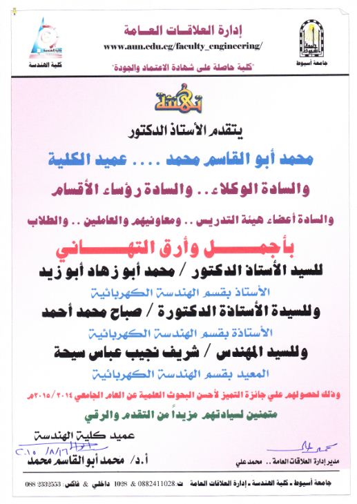 تهنئة من كلية الهندسة لكلاً من الأستاذ الدكتور/ محمد أبو زهاد - والأستاذة الدكتورة/ صباح محمد -بقسم الهندسة الكهربائية 23 أغسطس 2015 تهنئة من كلية الهندسة لكلاً من الأستاذ الدكتور/ محمد أبو زهاد - والأستاذة الدكتورة/ صباح محمد -بقسم الهندسة الكهربائية