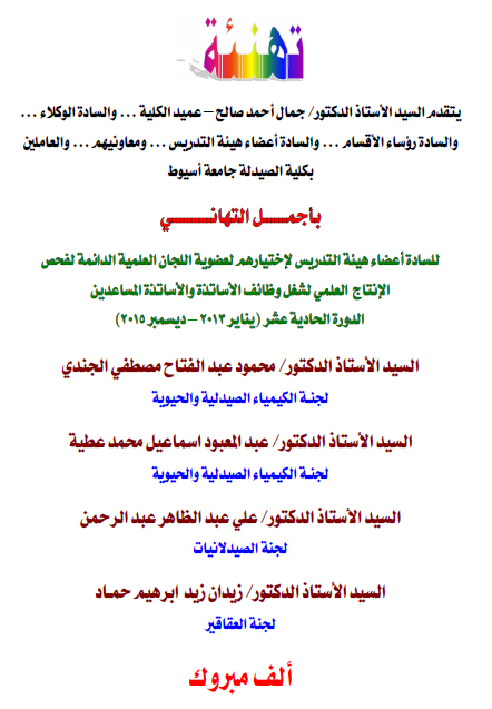تهنئة من كلية الصيدلة لبعض الأساتذة لإختيارهم لعضوية اللجان العلمية الدائمة لفحص الإنتاج العلمي لشغل وظائف الأساتذة والأساتذة المساعدين الدورة الحادية عشر.