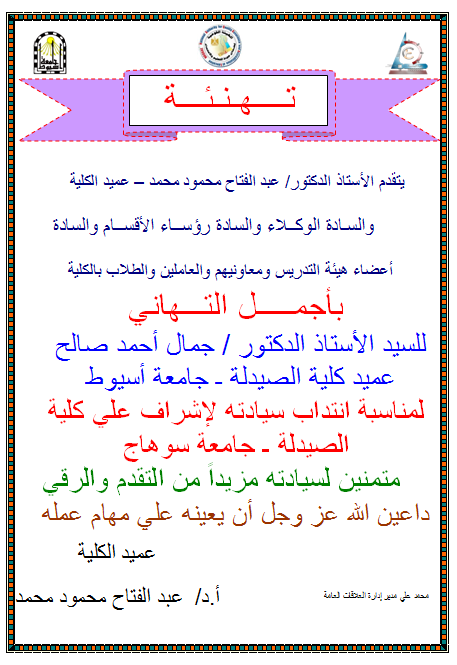 تهنئة مقدمة من عميد كلية هندسة الى عميد كلية الصيدلة بمناسبة انتدابة للإشراف على كلية الصيدلة جامعة سوهاج 24 يونيو 2013 تهنئة مقدمة من عميد كلية هندسة والسادة الوكلاء والسادة اعضاء هيئة التدريس الى عميد كلية الصيدلة بمناسبة انتدابة للإشراف على كلية الصيدلة جامعة سوهاج