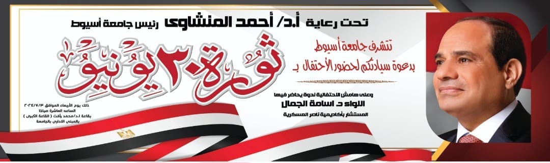 تنظم جامعة أسيوط، تحت رعاية الدكتور أحمد المنشاوي، رئيس الجامعة؛ احتفالية كبرى بالذكرى الحادية عشرة لثورة 30 يونيو، ومحاضرة للواء الدكتور أسامة الجمال المستشار بأكاديمية ناصر العسكرية، وذلك يوم الأربعاء 3 من يوليو، الساعة ١٠ صباحاً، بقاعة الدكتور محمد رأفت بمركز المؤتمرات بالمبنى الإداري بالجامعة، بحضور الأساتذة، والعاملين، والطلاب.