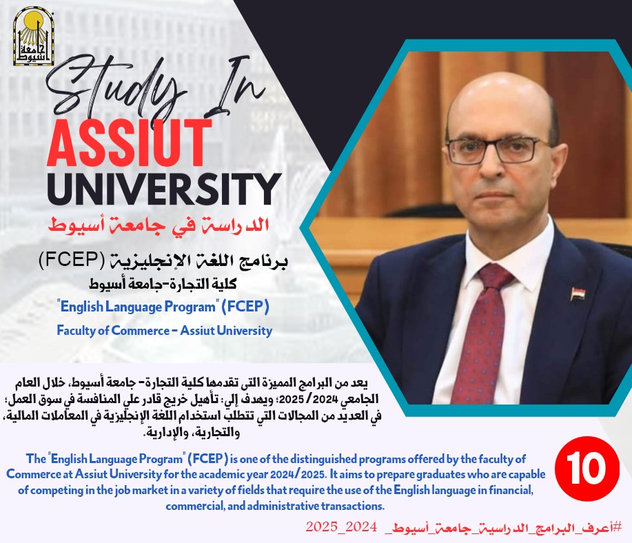 ?تقدم كلية التجارة بجامعة أسيوط؛ برنامج "اللغة الإنجليزية"(FCEP)، والذي يعد من البرامج المميزة؛ التي تهدف إلي: تأهيل خريج قادر علي المنافسة في سوق العمل؛ في العديد من المجالات التي تتطلب استخدام اللغة الإنجليزية في المعاملات المالية، والتجارية، والإدارية، تحت إشراف؛ الدكتور أحمد عبد المولى نائب رئيس الجامعة لشئون التعليم والطلاب، والدكتور علاء عبد الحفيظ عميد كلية التجارة، والدكتور طه زكريا أبو كريشة، منسق البرنامج، والدكتورة چاكلين ألفي نائب منسق البرنامج.