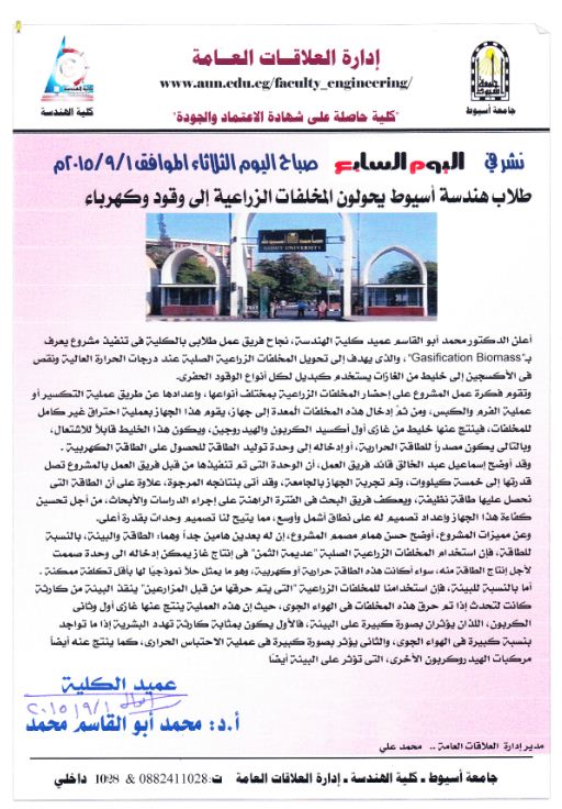 طلاب هندسة أسيوط يحولون المخلفات الزراعية الى وقود كهرباء 2 سبتمبر 2015 طلاب هندسة أسيوط يحولون المخلفات الزراعية الى وقود كهرباء