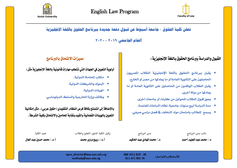تعلن كلية الحقوق عن قبول دفعة جديدة ببرنامج الحقوق باللغة الإنجليزية للعام الجامعي 2019/2020 26 أغسطس 2019