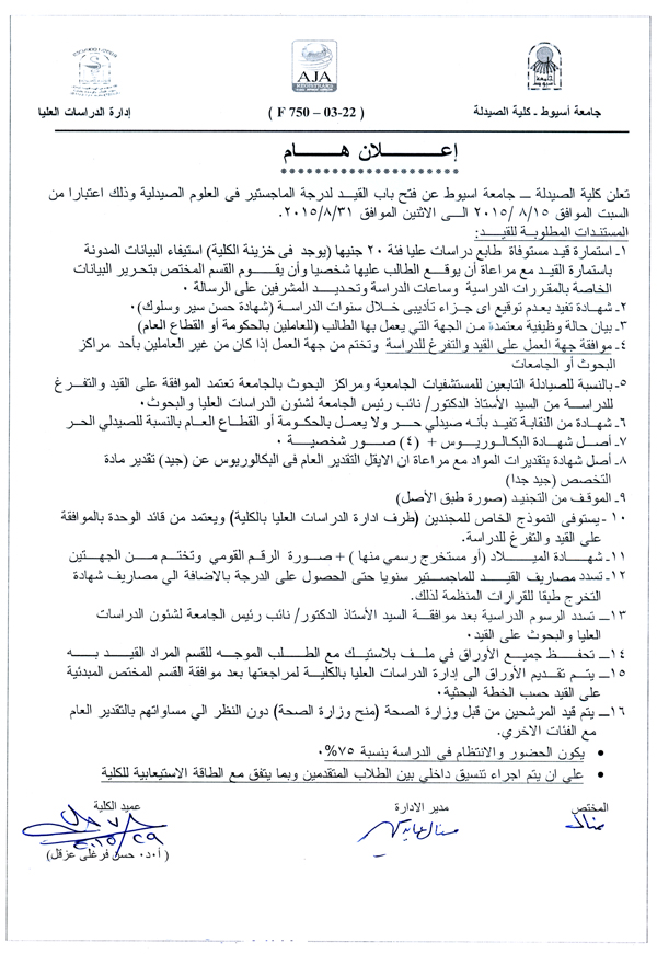 تعلن كلية الصيدلة جامعة أسيوط عن فتح باب القيد لدرجة الماجستير في العلوم الصيدلية اعتباراً من يوم السبت الموافق 15/8/2015 حتى الاثنين الموافق 31/8/2015م.