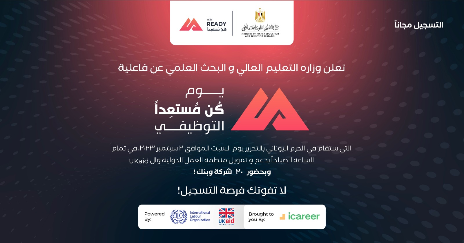 تعلن وزاره التعليم العالي و البحث العلمي ؛ عن فاعلية “يوم.. كن مستعدا للتوظيف” الذي سيقام في يوم السبت الموافق ٢ الثاني من سيبتمبر في تمام الساعة ١١ صباحا في الحرم اليوناني بالتحرير.