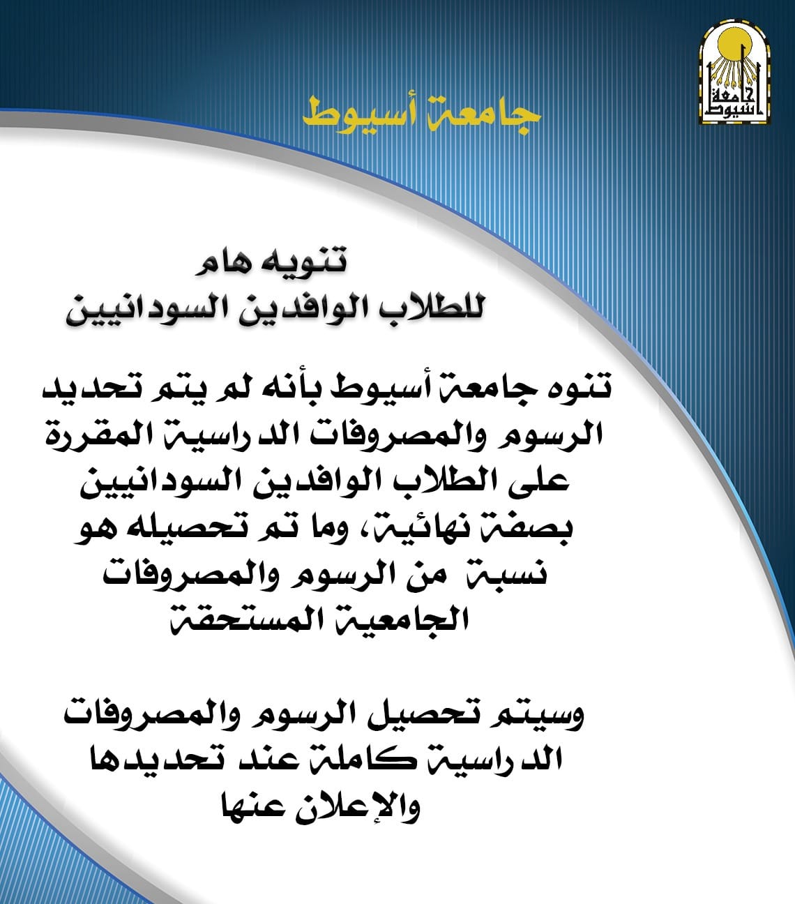 تنويه هام للطلاب الوافدين السودانيين الدارسين بجامعة أسيوط 22 يوليو 2023 تنويه هام للطلاب الوافدين السودانيين الدارسين بجامعة أسيوط بخصوص المصروفات والرسوم المقررة