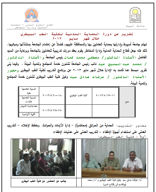 تهتم جامعة أسيوط وإدارتها بحماية العاملين بها والمحافظة عليهم، فضلاً عن إهتمام الجامعة بمنشآتها ومبانيها. ذلك كله جعل قطاع الحماية المدنية وإدارة المخاطر يقوم بعقد دورات تدريبية للعاملين بالجامعة وبرعاية من السيد الفاضل الأستاذ الدكتور/ مصطفى محمد كمال رئيس الجامعة والأستاذ الدكتور / محمد عبدالسميع عيد نائب رئيس الجامعة لشئون خدمة المجتمع وتنمية البيئة . وفيما يلى تقرير مبسط عما قامت به الإدارة خلال شهر مايو 2013 عن برنامج التدريب لكلية الطب البيطرى وحضور الأستاذ الدكتور / عرفات صادق سيد وكيل كلية الطب البيطرى لشئون خدمة المجتمع وتنمية البيئة.