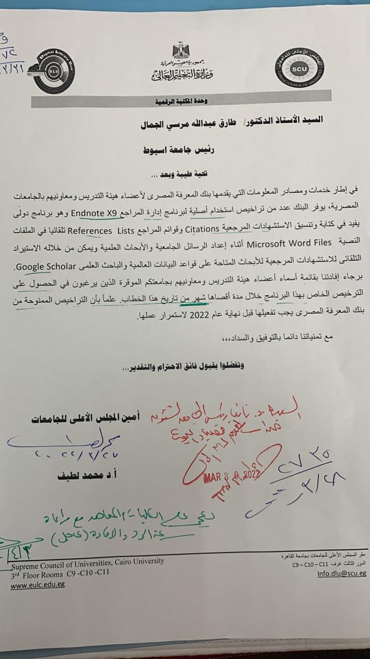 تحت رعاية الاستاذ الدكتور / طارق الجمال رئيس جامعة اسيوط والاستاذ الدكتور / احمد المنشاوى نائب رئيس الجامعة لشئون الدراسات العليا وبالتعاون مع المجلس الاعلى للجامعات وبنك المعرفة المصرى سوف يتم توفير نسخ مجانية لبرنامج End Note X9 فعلى من يرغب فى الاشتراك للحصول على نسخة من البرنامج ، يرجى الدخول على هذا الفورم وتسجيل بياناته ..