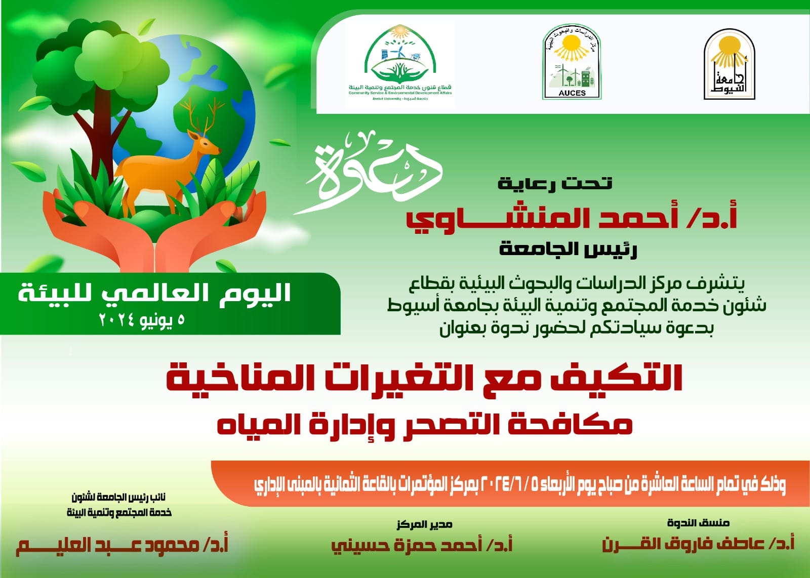 أكد الدكتور أحمد المنشاوي، أن الندوة تهدف إلى زيادة الوعي بالمخاطر التي تؤثر على البيئة نتيجة لتغير المناخ، وأساليب التكيف مع التغيرات المناخية، مؤكدًا أن جامعة أسيوط تحرص على الاحتفال باليوم العالمى للبيئة؛ لدعم جهود الدولة في التصدي لمشكلات البيئة والتغير المناخي، وتشجيع البحث العلمي في مجال الاستدامة والحفاظ على البيئة، والحد من تأثيرات التغيرات المناخية، في إطار تكامل خطة الجامعة التعليمية والبحثية مع أهداف التنمية المستدامة، ورؤية مصر 2030.