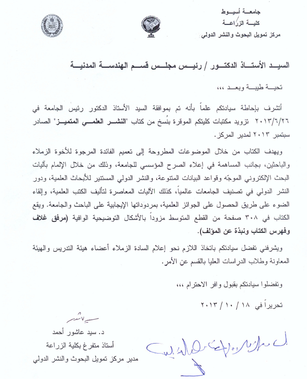 يهدف الكتاب من خلال الموضوعات المطروحة الى تعميم الفائدة المرجوة للأخوة الزملاء والباحثين بجانب المساهمة فى اعلاء الصرح المؤسسى للجامعة وذلك من خلال الإلمام بآليات البحث الإلكترونى الموجه وقواعد البيانات المتنوعة والنشر الدولى المستنير للأبحاث العلمية،ودور النشر الدولى فى تصنيف الجامعات عالمياً.
