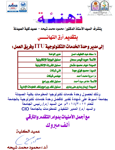 وحدة الخدمات التكنولوجية بكلية الصيدلة تحصل علي شهادة تقدير كأفضل وحدة خدمات تكنولوجية بالجامعة للعام 2017-2018م. 19 مارس 2019 وحدة الخدمات التكنولوجية بكلية الصيدلة تحصل علي شهادة تقدير كأفضل وحدة خدمات تكنولوجية بالجامعة للعام 2017-2018م.
