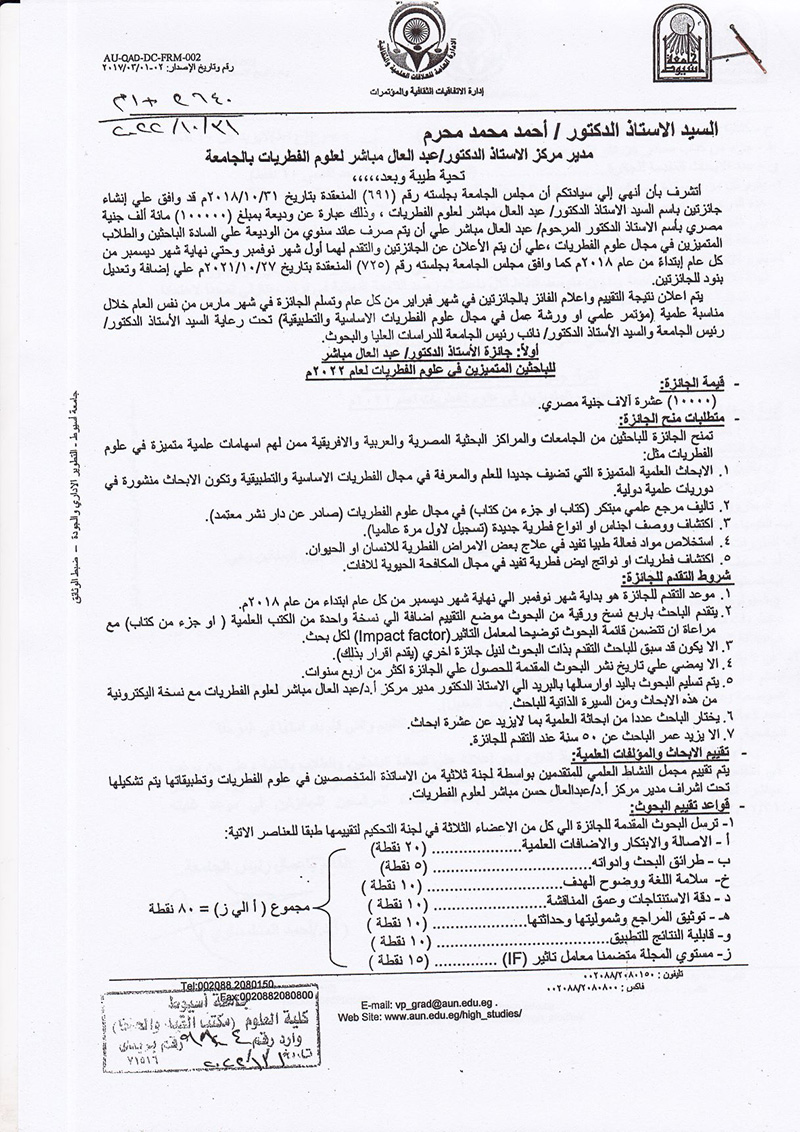 يعلن مركز أ.د./ عبدالعال حسن مباشر لعلوم الفطريات عن فتح باب التقدم لجائزة أ.د./ عبدالعال مباشر للباحثين المتميزين فى علوم الفطريات وتفاصيلها والتقدم كما بالملف المرفق . بالتوفيق للجميع
