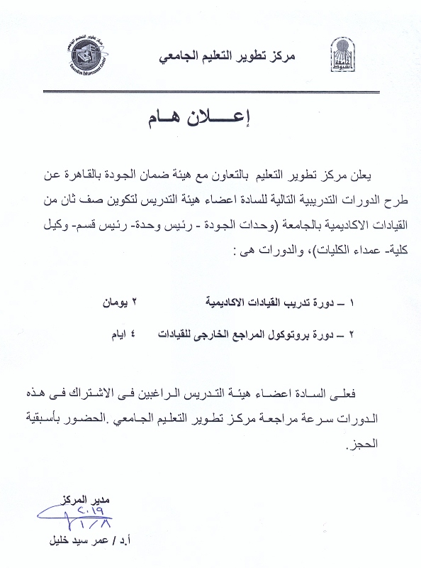 يعلن مركز تطوير التعليم عن انعقاد دورات تدريبية بالتعاون مع هيئة ضمان الجودة بالقاهرة 13 يناير 2019 يعلن مركز تطوير التعليم عن انعقاد دورات تدريبية بالتعاون مع هيئة ضمان الجودة بالقاهرة