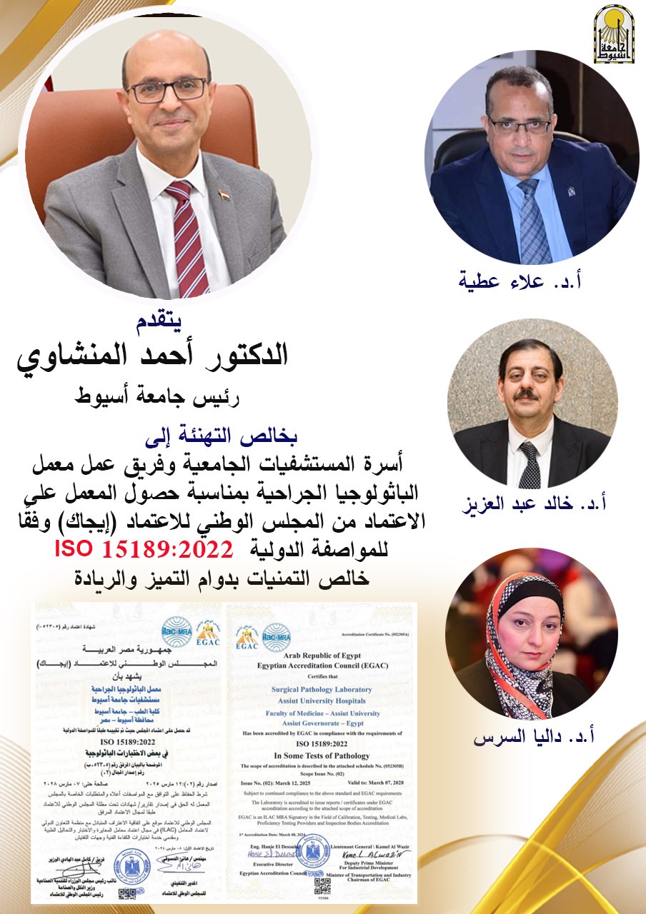 كما توجه بخالص الشكر والتقدير لفريق العمل المتميز بإشراف الدكتور علاء عطية، عميد كلية الطب ورئيس مجلس إدارة المستشفيات الجامعية، والدكتور خالد عبد العزيز، مدير المستشفى الجامعي الرئيسي، والدكتورة داليا السرس، رئيس قسم الباثولوجيا بكلية الطب، وفريق العمل الطبي والإداري للمعمل على جهودهم المخلصة التي أسهمت في تحقيق هذا النجاح.