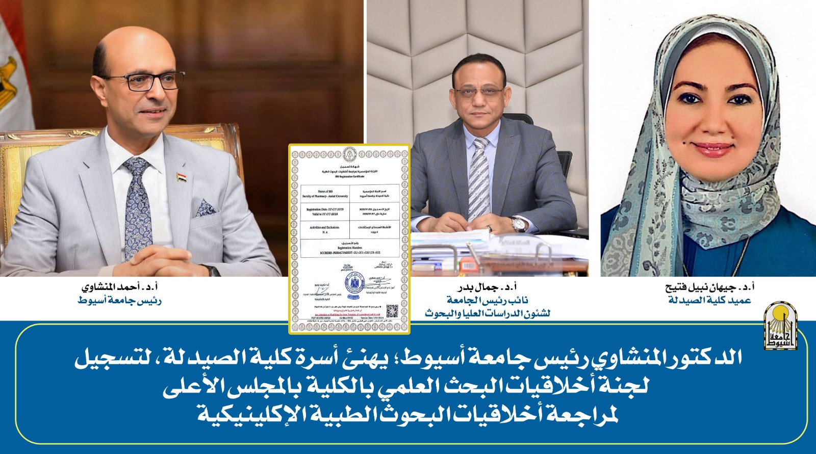 Prof. Ahmed El-Minshawy, president of Assiut University, announced the registration of the scientific research ethics committee at the Faculty of Pharmacy at the Supreme Council for reviewing the ethics of Clinical Medical Research, affiliated to the presidency of the Council of Ministers.