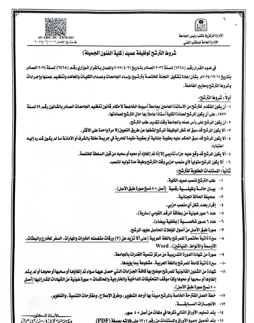 Assiut University announces the opening of the candidacy for the position of Dean of the Faculty of Fine Arts and the schedule of procedures
