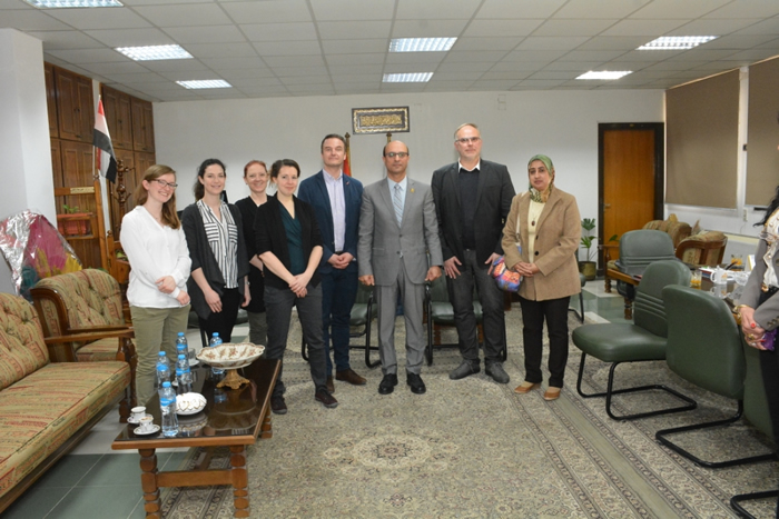 The delegation includes a group of faculty members from the University of Veterinary Medicine, Vienna, Austria, on their first visit to the university for educational and research purposes and for their participation in the launching of a workshop of the Institute for Molecular Biology Research and Studies which is scheduled to be held from February 18 to 20 under the title "Isolation of basic cells and modification of cell behavior using CRISPR technology for genetic modification." The meeting is to be held in the presence of Dr. Asmaa Abdel Nasser, Dean of the Institute of Molecular Biology.
