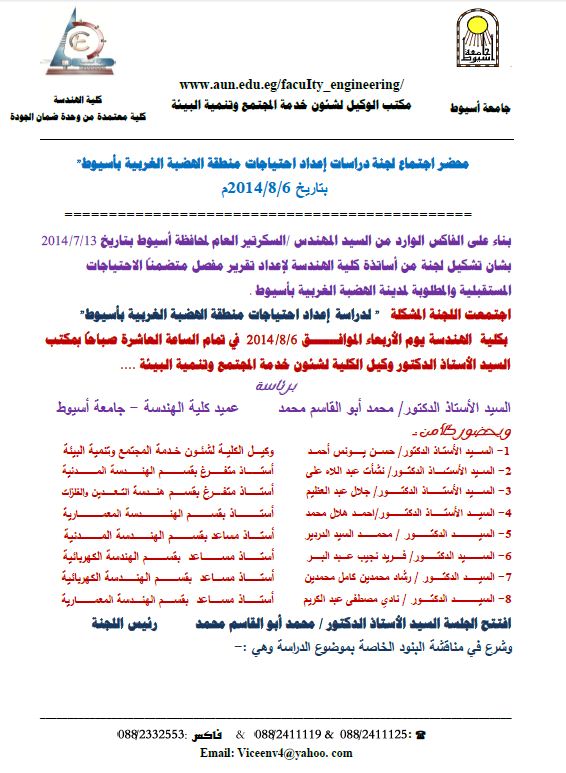 The general secretary of assiut governorate sent a fax on the 13th of July 2014 to the faculty of engineering asking them to form a committee of the faculty staff to prepare a detailed report about the futuristic needs and requirements to the western plataeu project in assiut. The committe was formed and had a meeting on 6th of August 2014 at 10:00 a.m. in the vice dean of community services and environmental development office and under the supervision of the dean of the faculty professor/ Mohammad Abo El-Kasem.