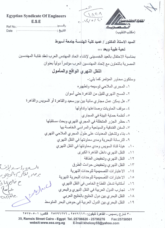 Egyptian Engineers Syndicate will hold an international conference entitled "River Transportation between Reality and Hope" in cooperation with Federal Arab of Engineers. The deadline to deliver the researches will be in June 1st,2013. The conference will be held in the last week of October.