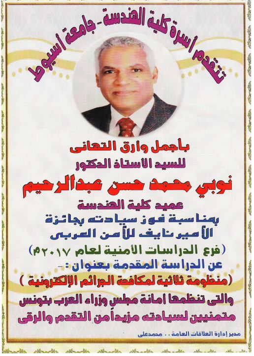 Congratulations from the family of engineering faculty to Mr. Nubi Mohamed Hasan Abdel Rahim on the occasion of the award of Prince Naif for Arab security