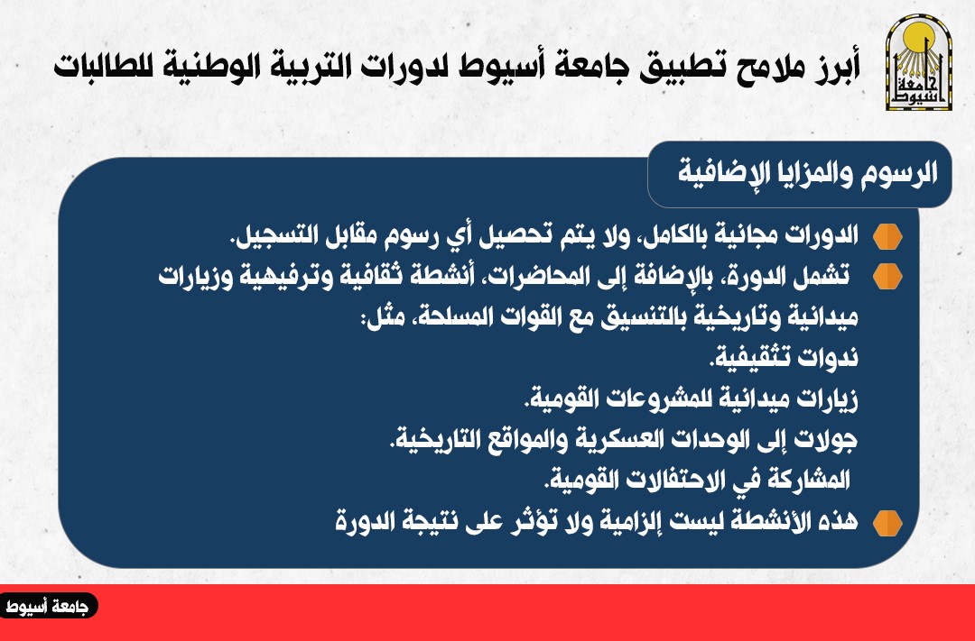 Assiut University offers national education courses for female students, within the framework of the protocol of cooperation between the Ministry of higher education and the leadership of the popular defense forces and the military, which aims to enhance national awareness and develop the spirit of belonging among female students, and prepare them to face the challenges that may face the homeland, in addition to building a new generation of young women capable of taking responsibility and active participation in serving their homeland.