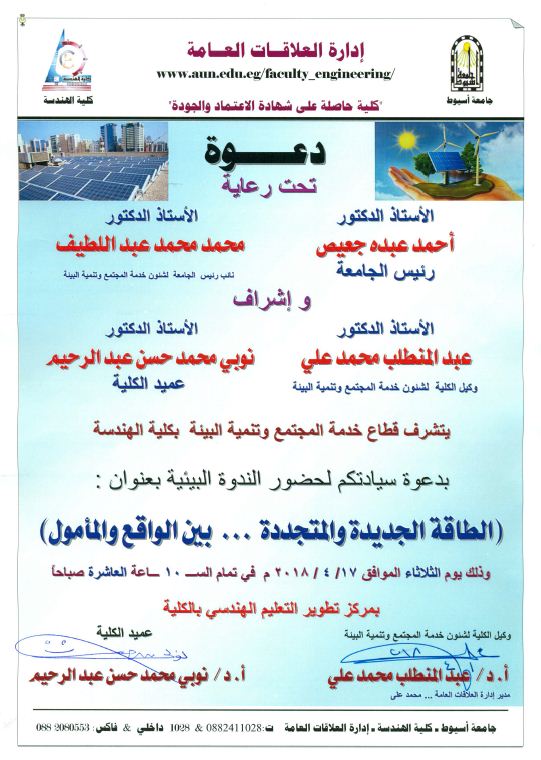 Invitación de la Facultad de ingeniería a un simposio medioambiental titulado "nuevas energías renovables... Entre la realidad y la esperanza) 10 April 2018