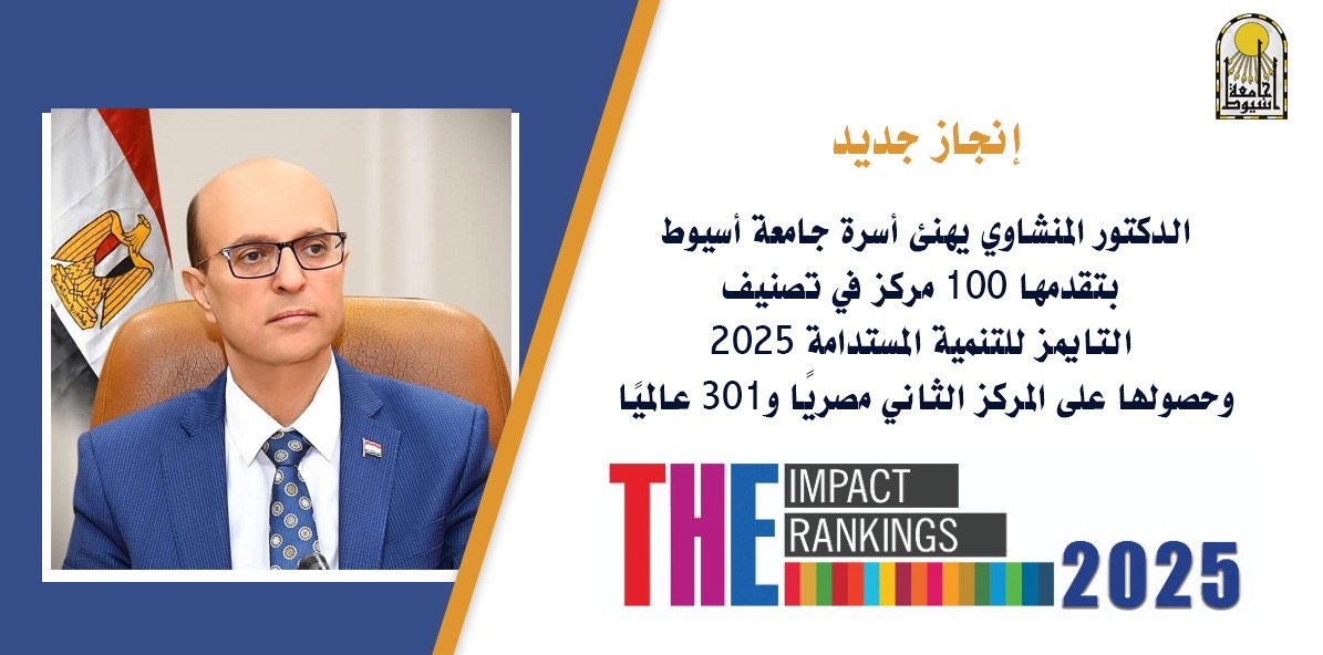 Dr. Ahmed El-Minshawy, president of Assiut University, congratulated the university family of faculty, staff, and students on the occasion of the new achievement of the university by advancing 100 places globally in the Times sustainable development ranking for 2025 (the Impact Ranking), and obtaining the second place at the level of Egyptian universities, and ranked 301 globally out of 2318 universities representing 125 countries around the world.