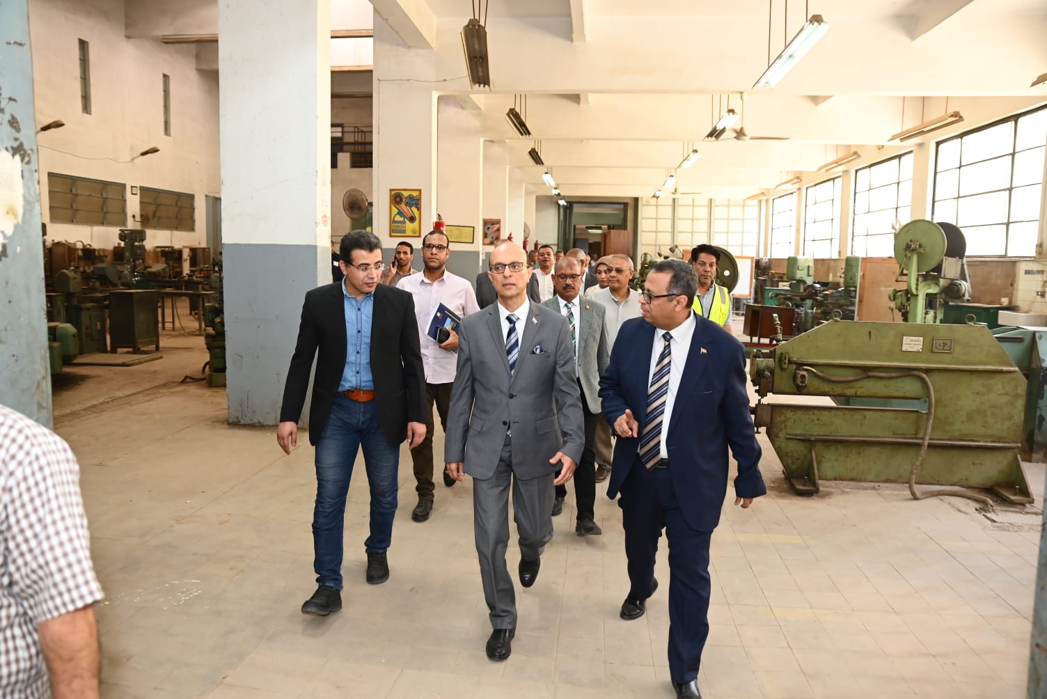 The president of the university was accompanied during his tour by Dr. Khaled Salah, dean of the College of Engineering, Dr. Mohammed Safwat, vice dean for community service and Environmental Development, Dr. Shehata Al-Dabaa, engineering advisor to the president of the University, Dr. Mahmoud Heshmat, supervisor of workshops and professor at the Department of mechanical design and production, as well as several department heads and faculty members of the college.