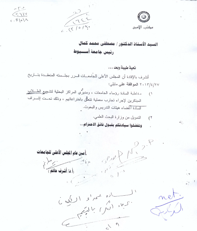 The Supreme Council of Universities asks the presidents of the universities to make the innovative students do their researches in the laboratories under the supervision of the faculty members.