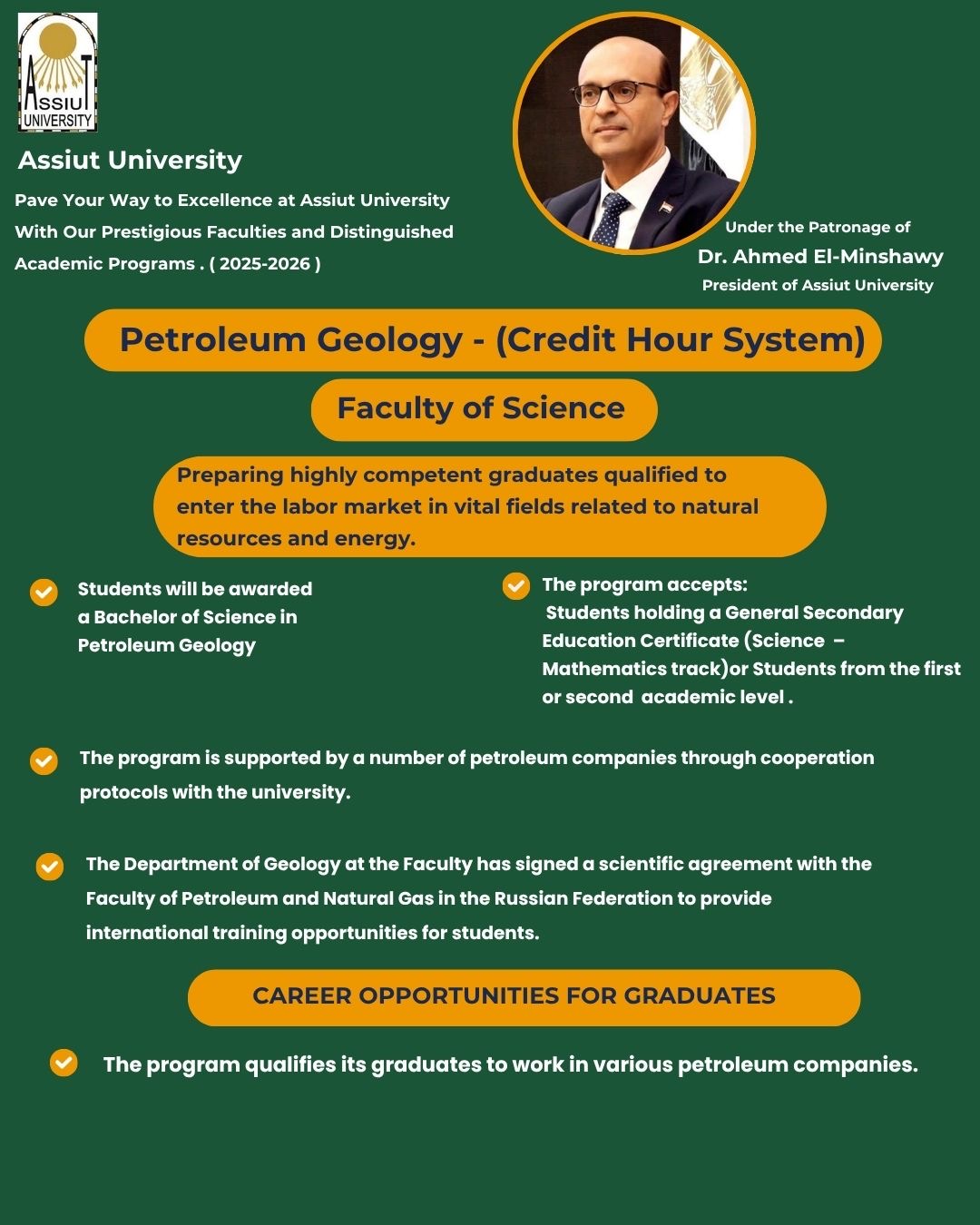 As part of its continuous efforts to expand its specialized academic offerings, the Faculty of Science at Assiut University is pleased to announce the launch of a new academic program in Petroleum Geology for the 2025/2026 academic year. The program is part of the university’s strategic plan to modernize and develop its academic programs in line with local and global labor market needs, and to support the national vision for a more advanced and future-ready higher education system.